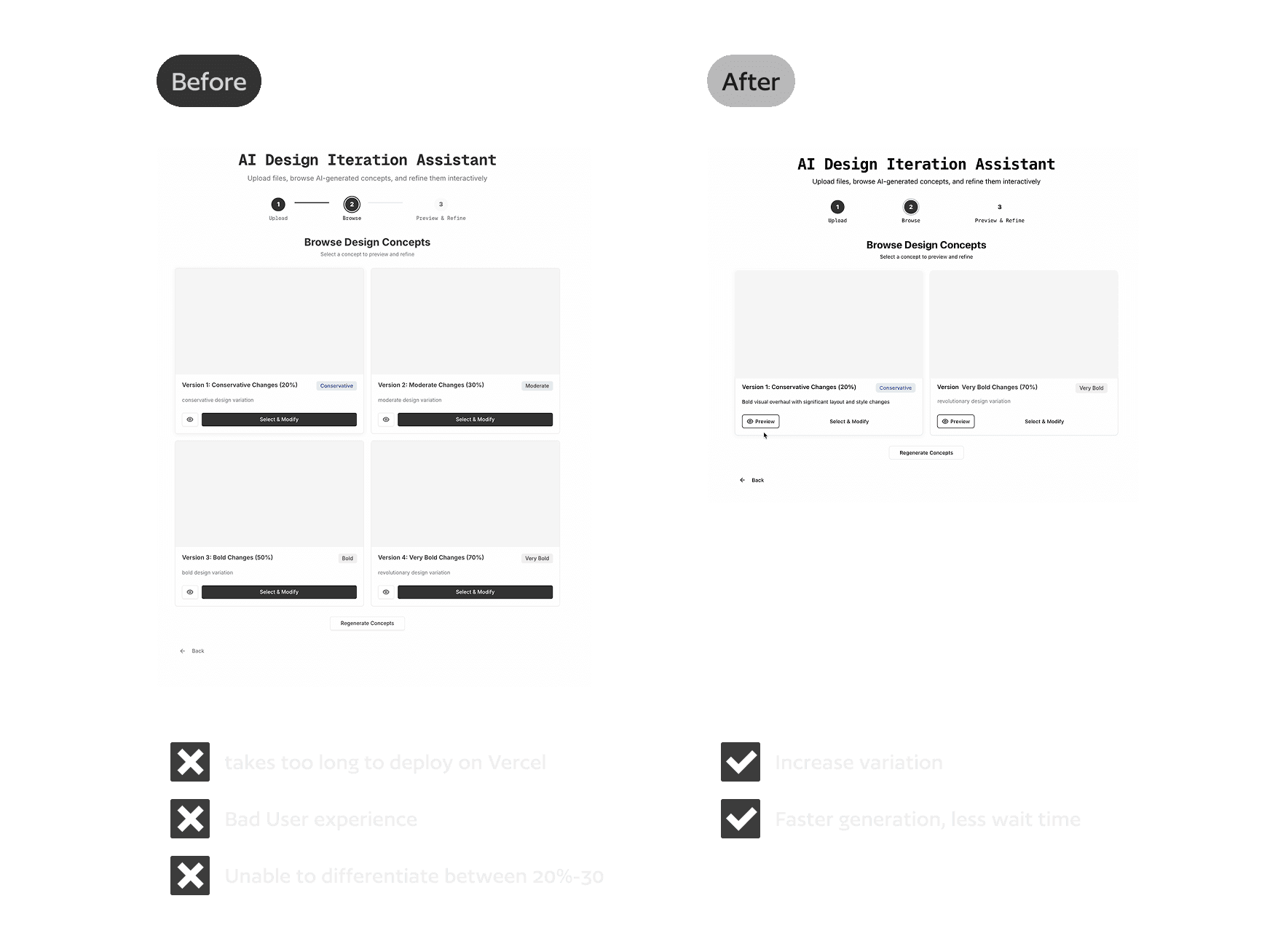 This tool doesn’t replace designers, it changes when designers enter the process. Instead of spending multiple days crafting a mockup that may not be aligned with business goals, designers now spend 20 minutes generating aligned options, then apply their craft to refining the right direction.