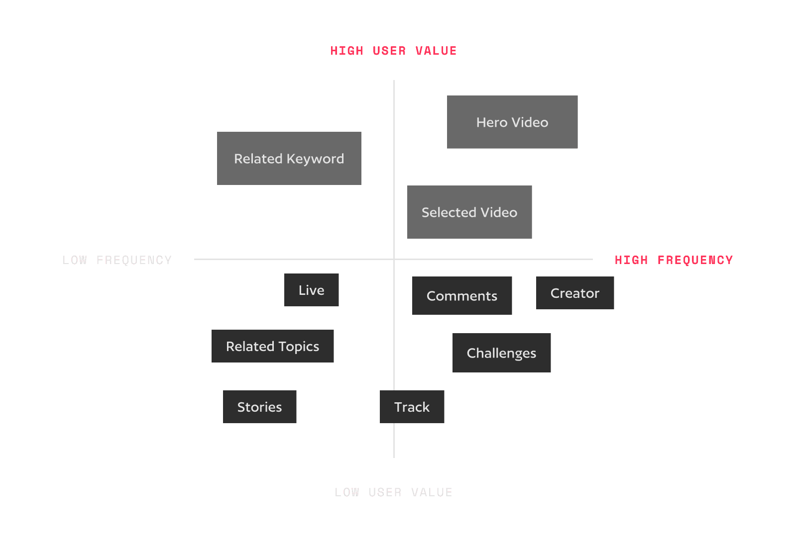 Each module (e.g., video feed, keyword groups, creator highlights) can be independently optimized or A/B tested